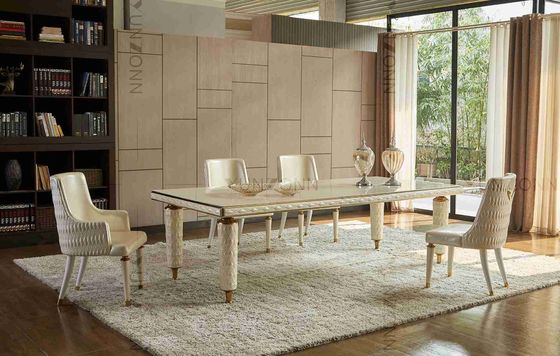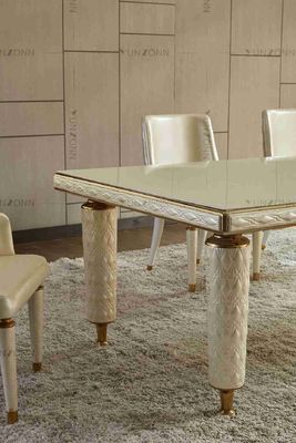 Nakış Deri Kapaklı Yemek Masası Beyaz Temperli Cam Üst Paslanmaz Çelik Çerçeve Ev İçin